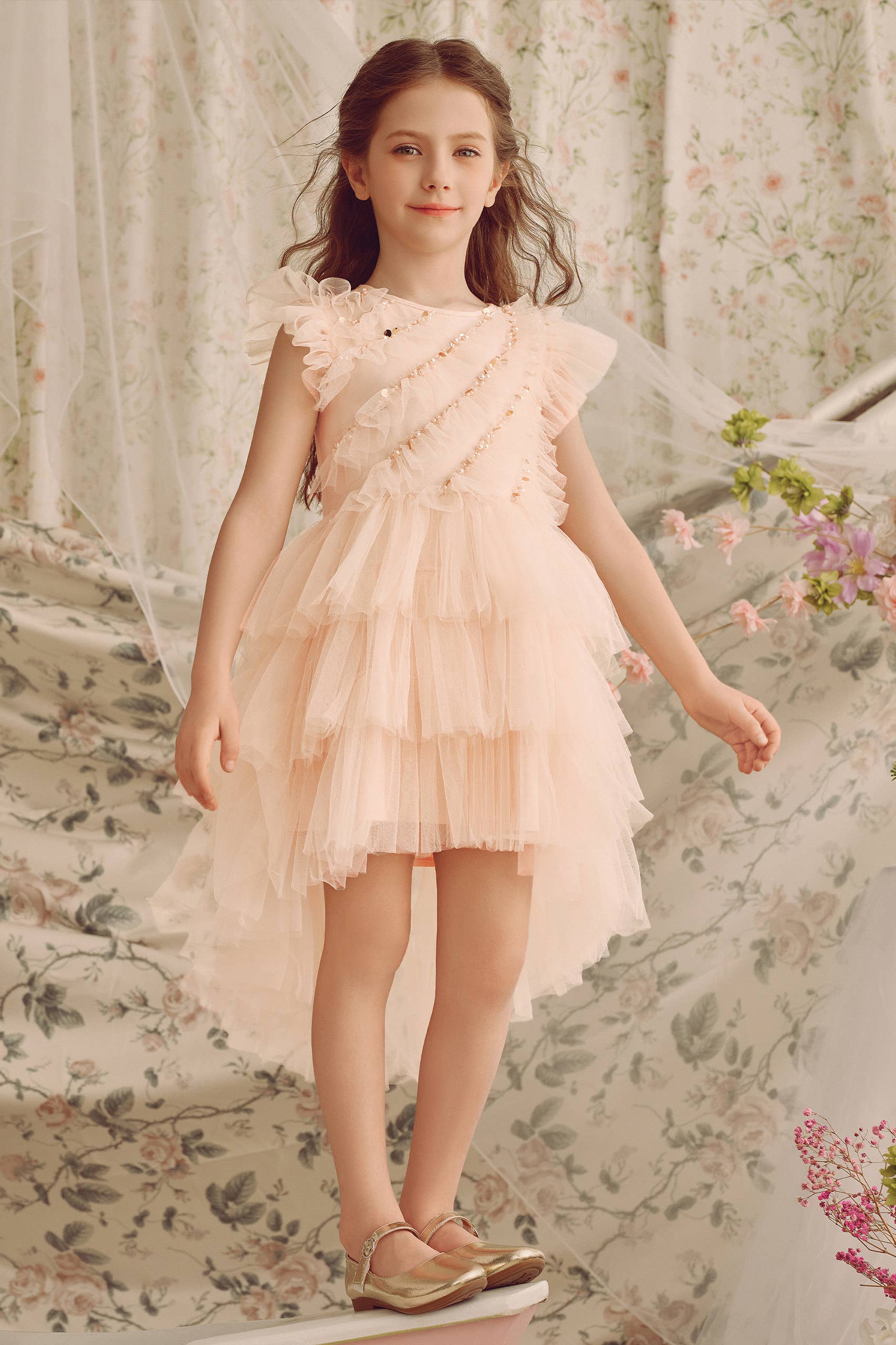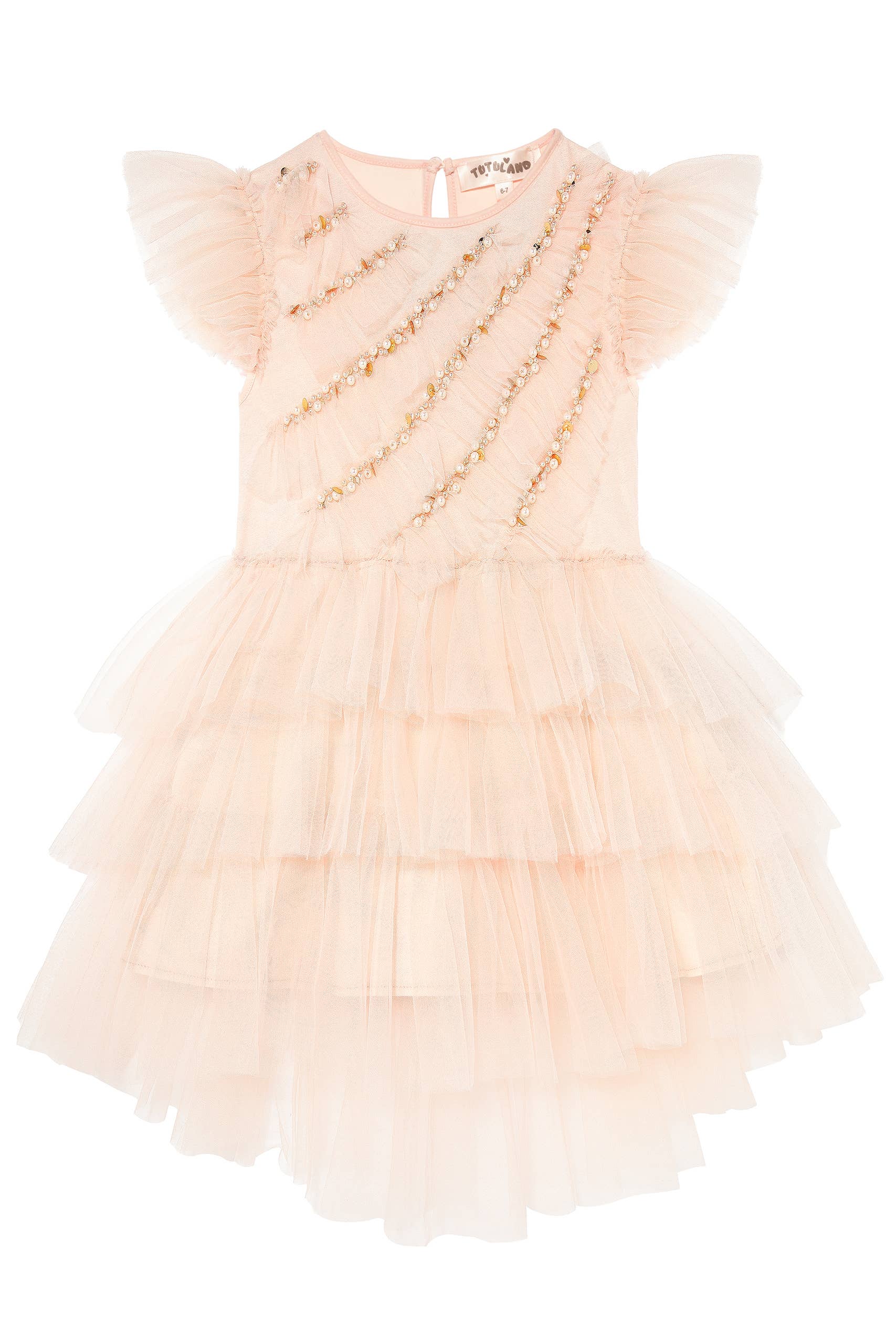 Designed with whimsical charm and delightful elegance, this dress is perfect for making cherished memories. The delicate flutter sleeves, adorned with tiny pearls, add a touch of fairy-tale magic, while the tutu dress ensures a playful twirl that every little girl will adore.